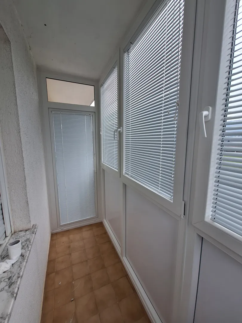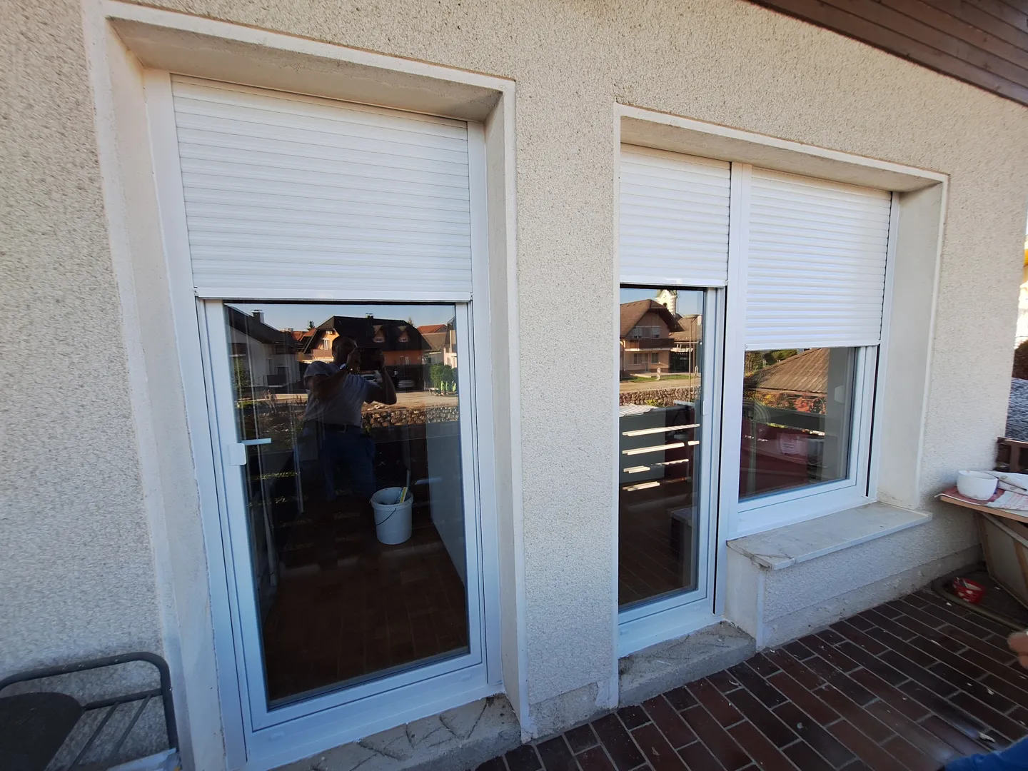 2x okno (enokrilno) troslojni termopan dimenzije x cm + roleta 2x, 1x okno (dvokrilno s pokončnikom) dvoslojni termopan, dimenzije x cm + roleta, 1x balkonska vrata (enokrilna) dvoslojni termopan 77x cm, 1x balkonska vrata (enokrilna) dvoslojni termopan 75x cm + roleta. Vse rolete so nadokenske, barva bela.