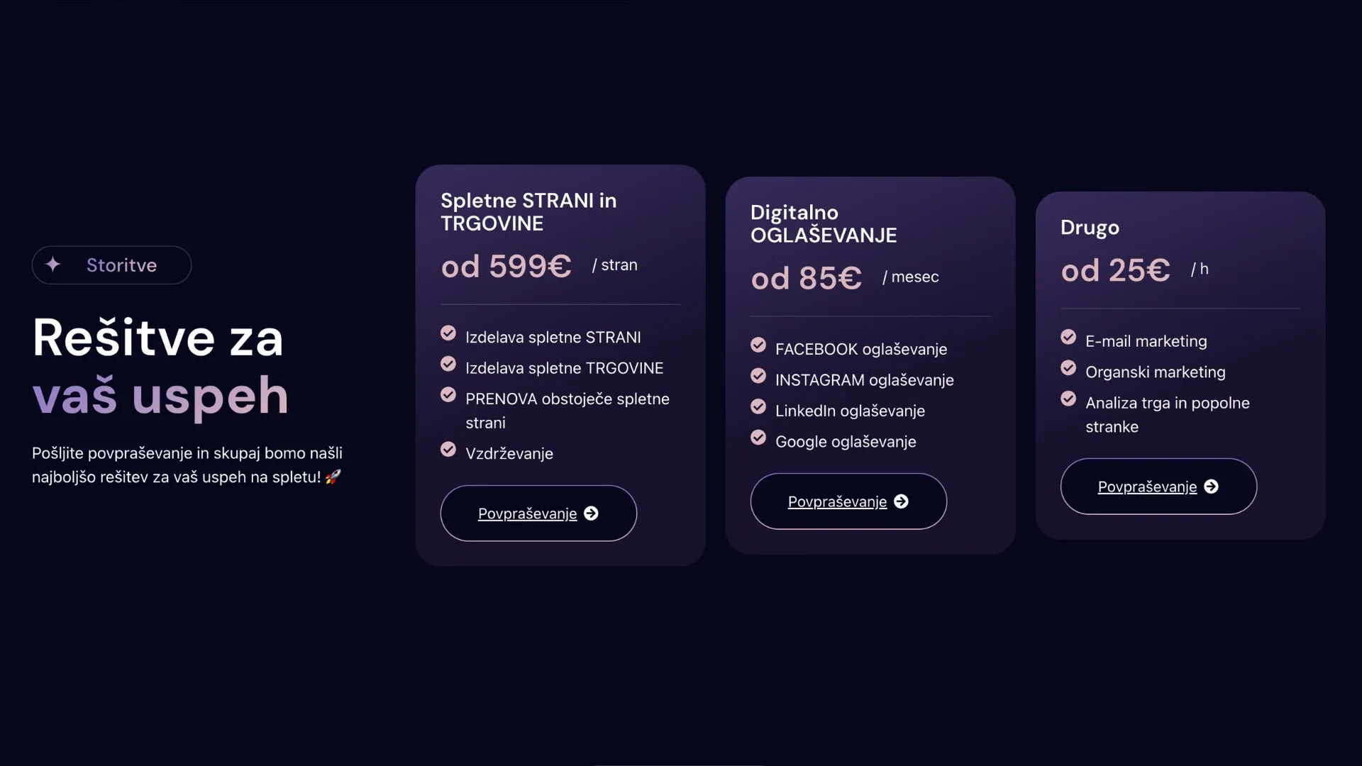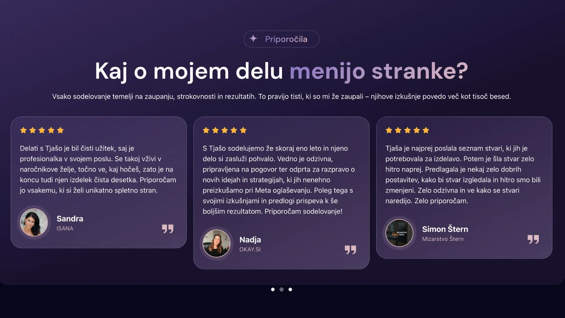 Zahtevaj ponudboDelo je bilo res super opravljeno; Tjaša je bila prijazna, prilagodljiva in ves čas ponujala odlično svetovanje. Z mano je potrpežljivo šla čez vsako podrobnost in spletno trgovino prilagodila točno temu, kar potrebujem, cist top izkušnja!