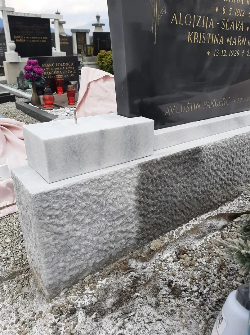 Pozdravljeni, dvojni grob. Priložene slike. Rad bi preprost nagrobnik, robniki marmor v barvi kot na sliki desni, spredaj prostor za sveče, v zgornjih dveh kotih pregrajeno za zemljo, malo večje kot je na sliki zdaj, ostalo pesek. plošča v barvi robnikov na podstavku. Napis v treh vrsticah + vrtnica. Pokopališče je v Kranju. Za končno odločitev se seveda oglasimo in skupaj dorečemo finese. Hvala,