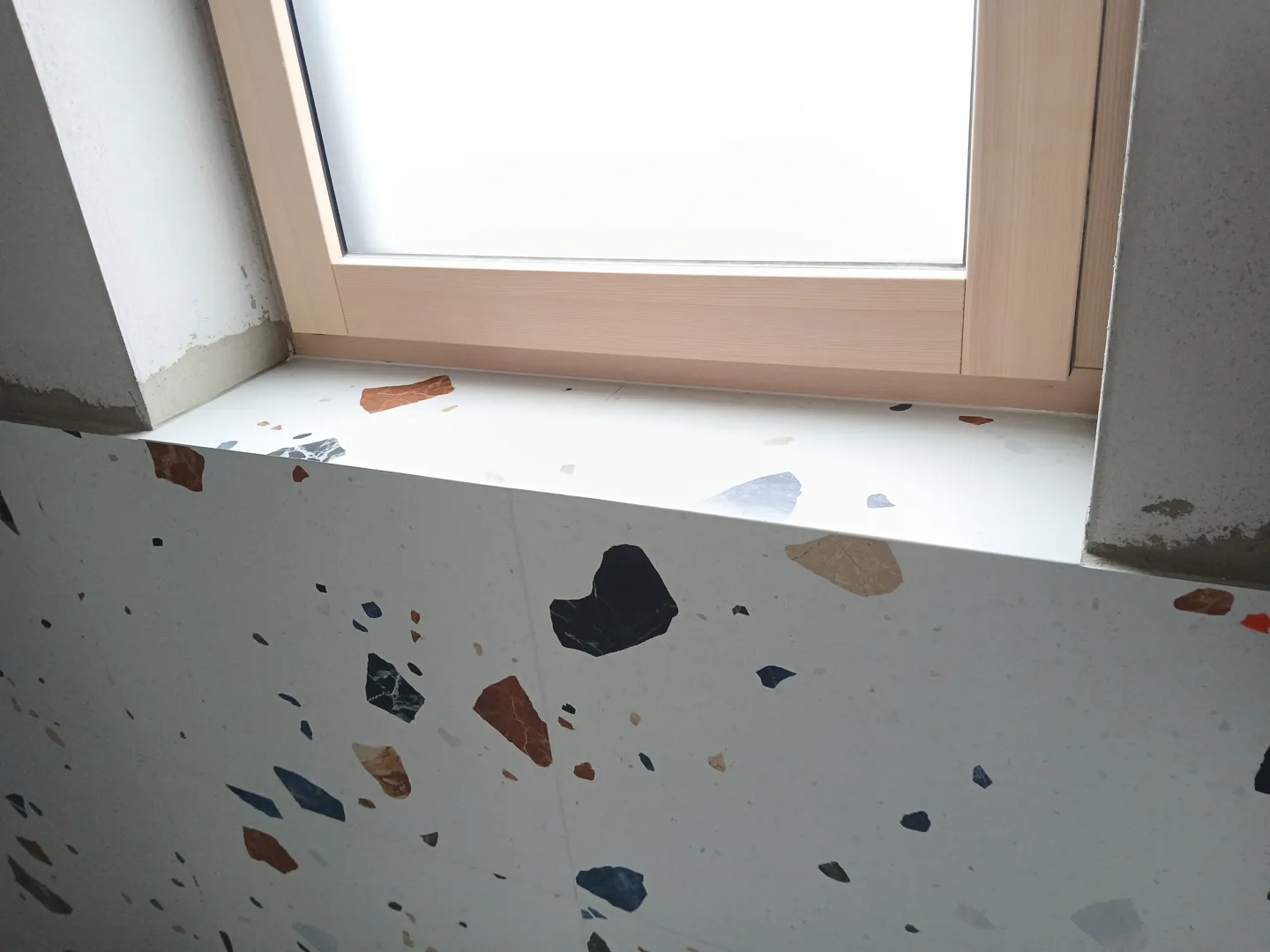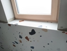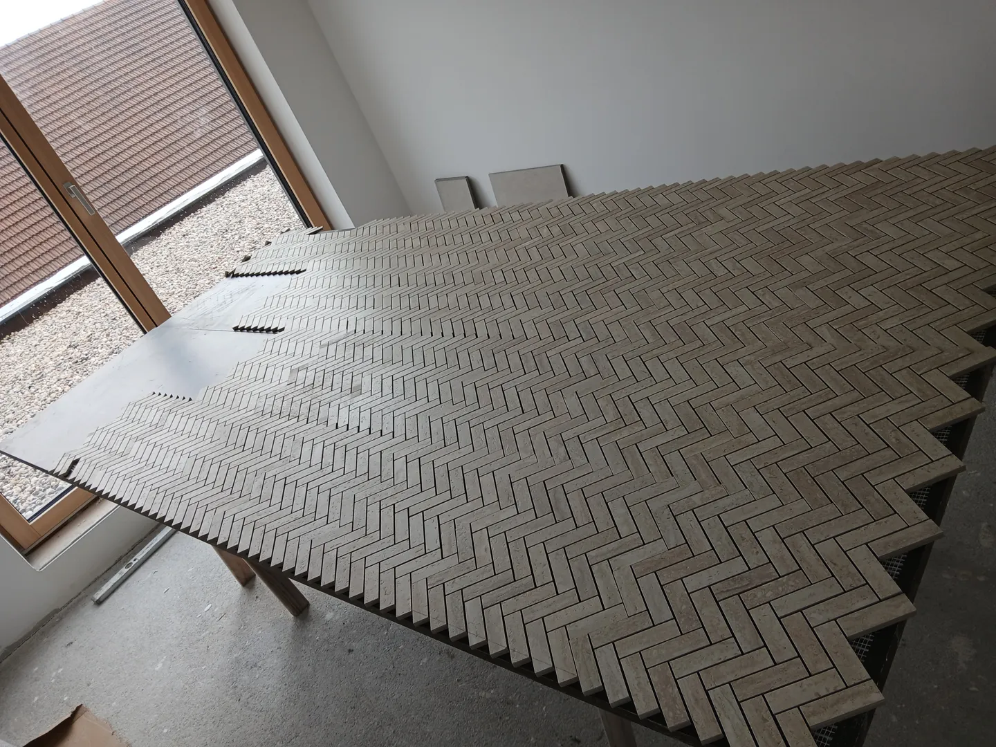 Polaganje granitogres plošč na 22,4 m² s stekleno steno.