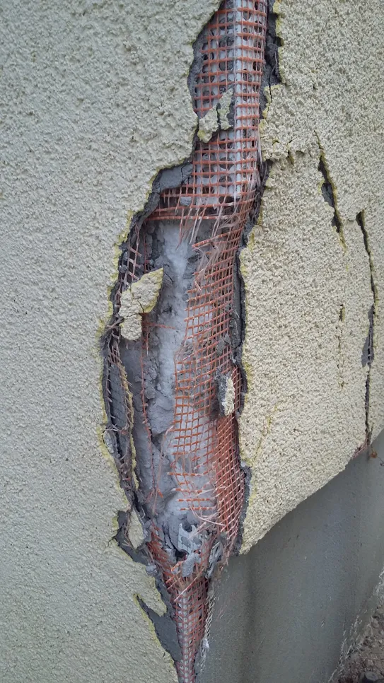 - Vrsta poškodbe: Odkrušen omet, razpoke, izpostavljena mrežica, vdor vode.