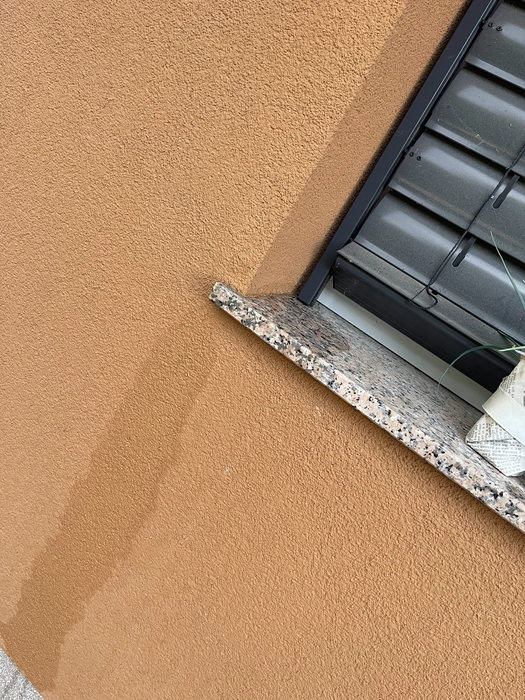 Visible water stain on a beige exterior wall beneath a window sill, indicating possible leakage.