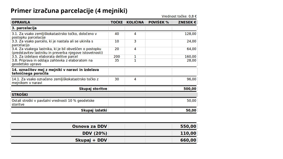 Posamezna opravila so ovrednotena s številom točk, ki so določena v tarifnem delu Cenika geodetskih storitev. Vsota točk se pomnoži z vrednostjo točk, k tej ceni pa se dodajo še drugi stroški in davek na dodano vrednost. Vrednost točke je ob uskladitvi znašala 0,80 evra.