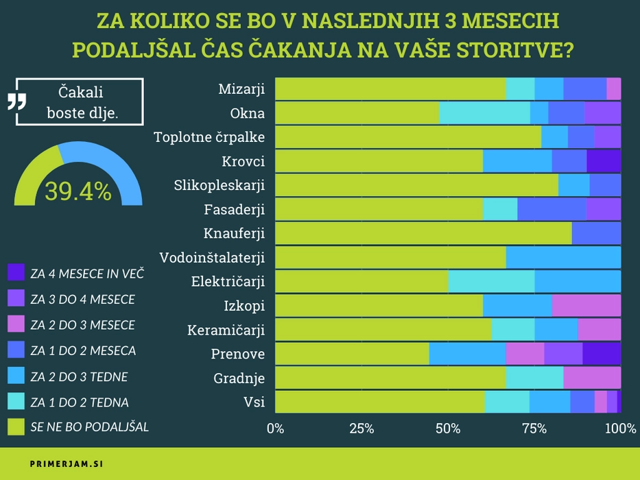 Najbolj so se v zadnjem letu podaljšali roki izvedb za prenove in adaptacije (dve tretjini podjetij boste čakali dlje; eno tretjino od 2 do 4 mesece dlje.) Po drugi strani več kot 60 odstotkov keramičarjev in dve tretjini gradbincev danes ni treba čakati nič dlje kot pred enim letom.