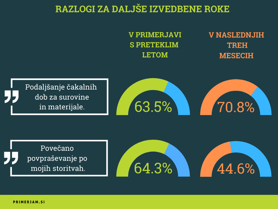 • Dve tretjini pravita, da so se izvedbeni roki zaradi zamud pri dobavah surovin in povečanega povpraševanja po njihovih storitvah podaljšali.