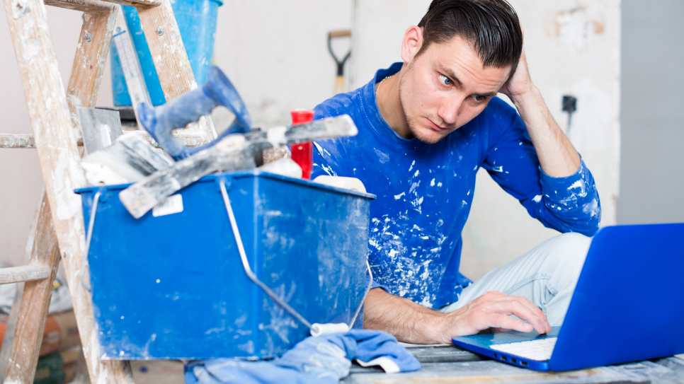 Slikopleskar se zaskrbljeno sklanja nad prenosni računalnik. Izvedbeni roki so vse daljši.