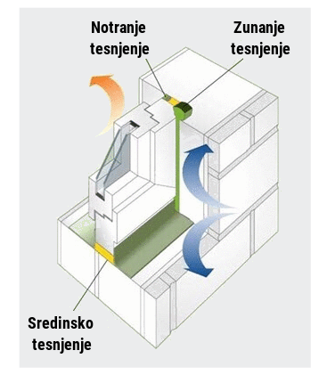 Shema RAL montaže: prikaz zunanjega, sredinskega in notranjega tesnjenja