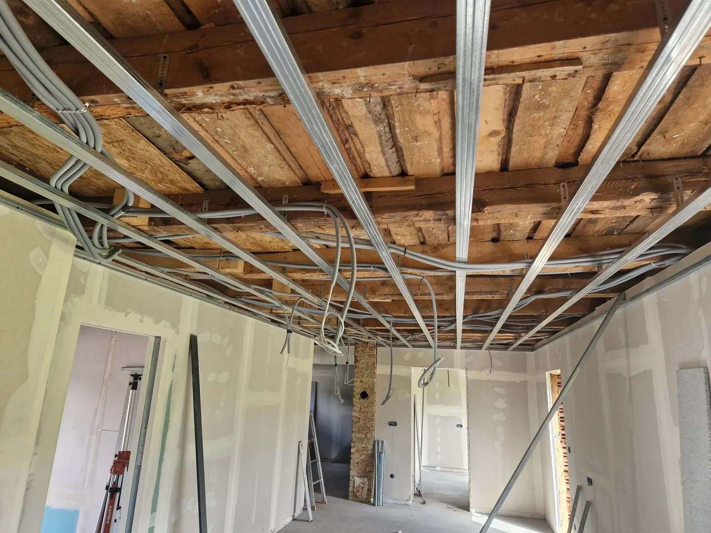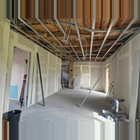 Pozdravljeni, iščem izvajalca za izvedbo manjšega projekta suhomontažnega stropa (Knauf) na obstoječ lesen strop v veznem hodniku mansarde. Strop hodnika je predeljen s preklado. Mere so na priloženi skici. Kotne letve bom pred začetkom del pobral dol. V kratkem delu hodnika bi pustili eno ploščo, dolgaga pa bi razdelili na tri, vse spuščene za 3-5 cm (za debelino montažnih letev). Okrog plošč in med njimi pa bi obdelal s Knufom kar direkt na lesen strop (če gre). Še svetlobne LED profile bi dali nekako v plošče, ob robu raje ne, ker so stene krive in bi preveč poudarili neravnine.
