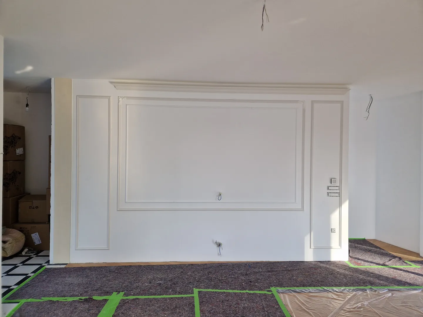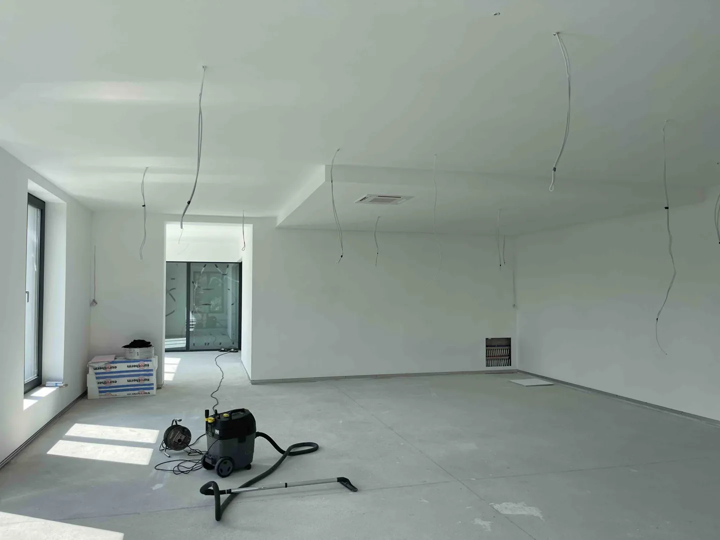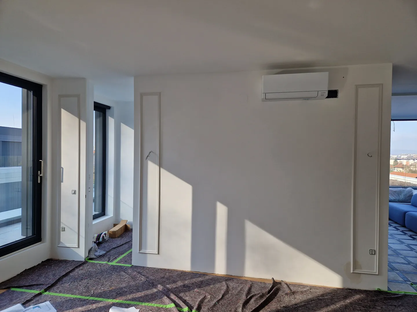 Izdelava predelne stene (knauf) v prostoru nadstandardne višine, zvočno izolativne, z izrezom za vrata. Prosimo tudi za ponudbo za dobavo in montažo vrat, ki naj bodo podobna obstoječim, steklenim, z mat površino s črtami (kupljena pred cca 4 leti v bauhausu). Prosimo za ogled na terenu s predhodno najavo na zgornjo številko. Stena na sliki označena z rdečo. Prosimo za predračun. Objekt je v centru Litije.