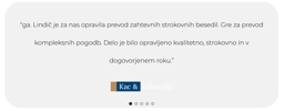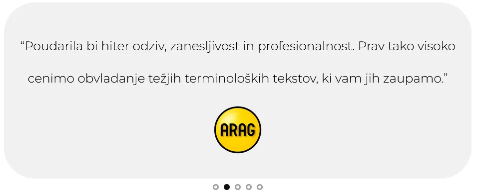 Zahtevaj ponudboZelo sem zadovoljen z lektoriranjem angleščine. Delo je bilo opravljeno brezhibno, svetovanje pa odlično in zelo uporabno. Bili so prilagodljivi glede rokov, prijazni ter hitro odzivni. Profesionalni, zanesljivi in natančni, poštena cena — res priporočam