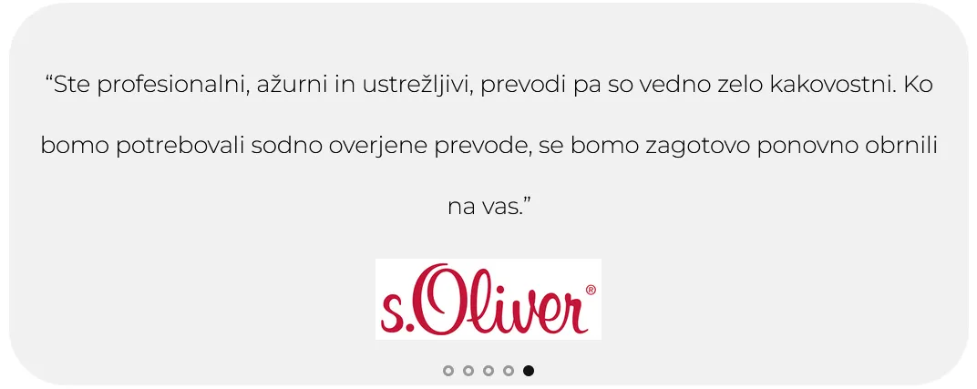 Zahtevaj ponudboZelo zadovoljen sem s storitvijo sodnega prevoda pri tej prevajalski agenciji. Delo je bilo odlično opravljeno, vse je bilo jasno in natančno. Priporočam vsem, ki potrebujejo zanesljiv sodni prevod. Resnično profesionalna storitev! Hvala!