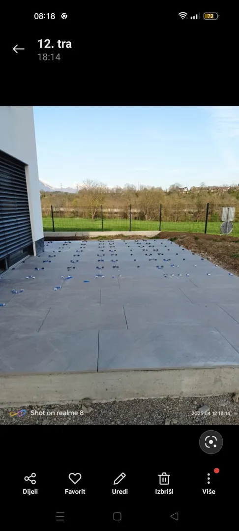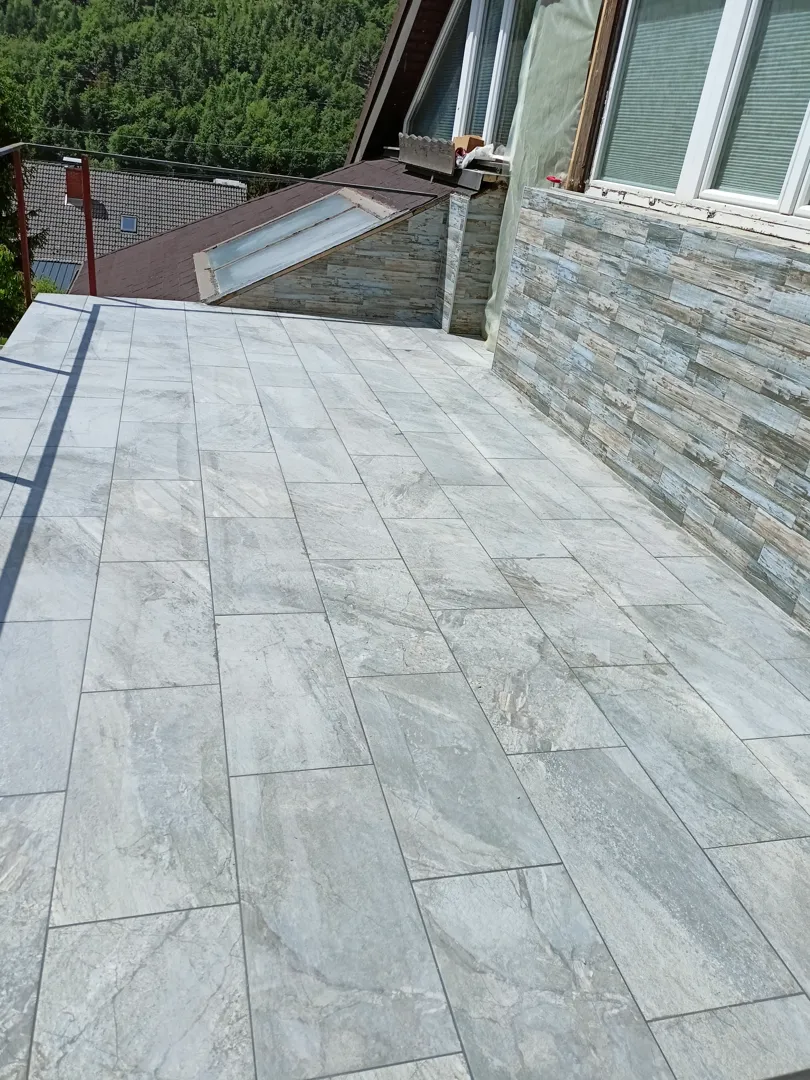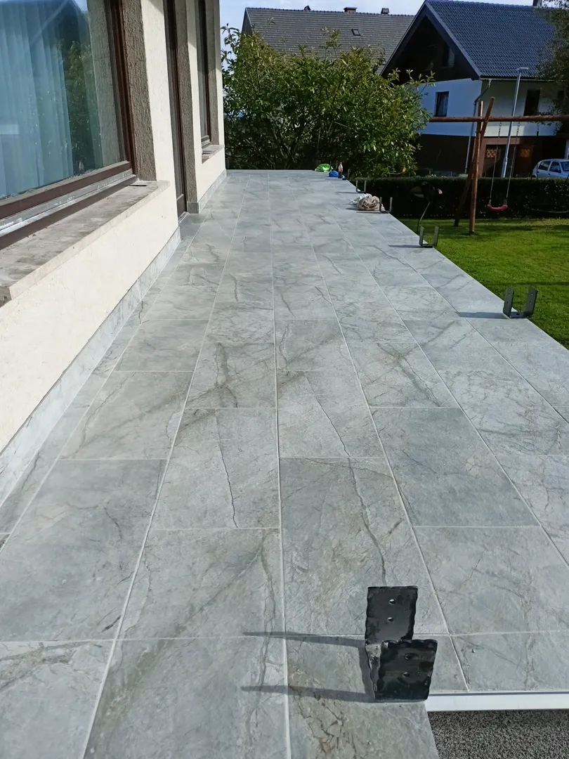 Pozdravljeni, Prosil bi za polaganje ploščic ali kamna za cca. 45 m2 površine. Na fotografijah je razvidno: - najbolj kritične so stopnice, ki vodijo v spodnji prostor, tam je letos pozimi zmetalo ven kar nekaj ploščic - na terasi ploščice še ne pokajo, vendar je na nekaterih fugah že mah - škarpa je rahlo napokana