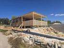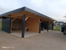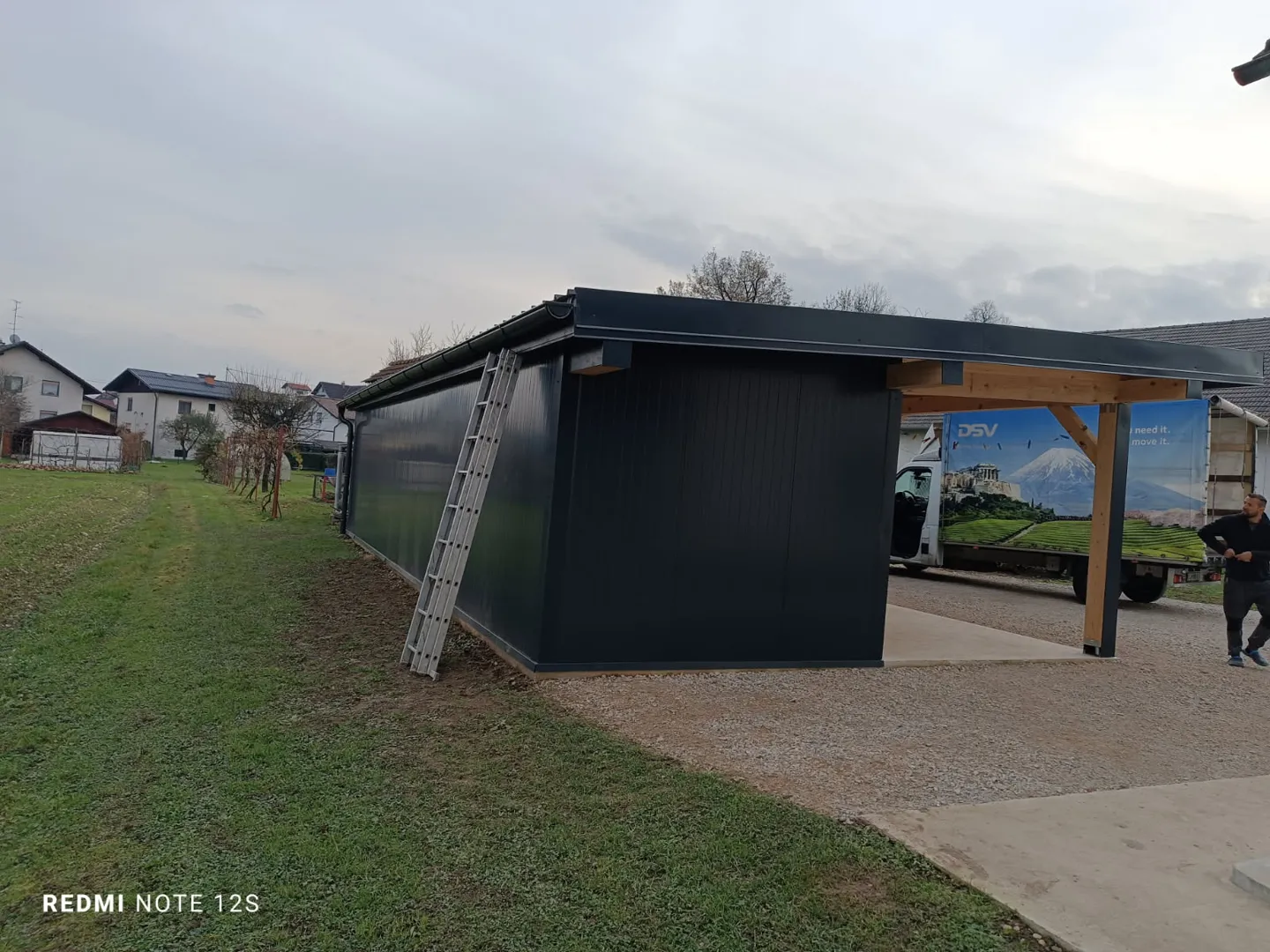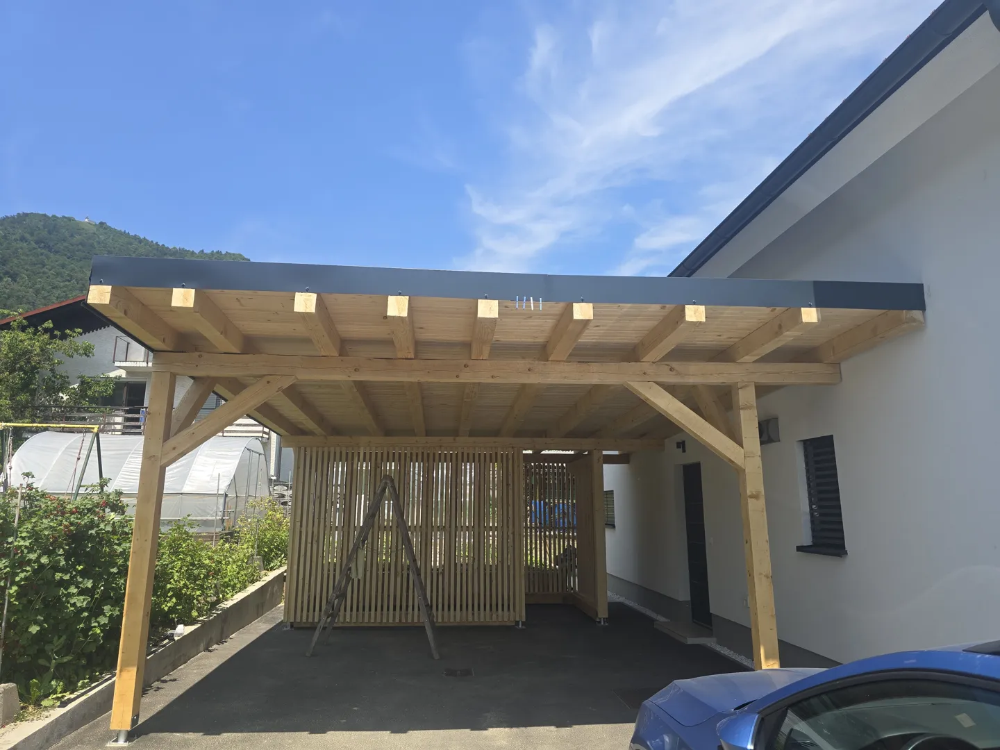 Nadstrešek za avto z integriranim balkonom v izmeri 6x4,5 m. Kritina polykarbonat. Objekt se nahaja na avstrijskem Koroskem (Eberndorf). Hvala in LP