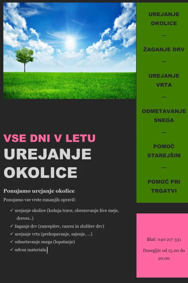 O nas: Nudimo Urejanje Okolice: - obrezovanje dreves Odstranjevanje... - obrezovanje žive meje Odstranjevanje.. - košnja trave - prezračevnaje trave - zasaditve rastlin Tudi poleg košnje trave ter obrezovanje živih mej in dreves vam tudi uredimo brežine z zasaditvijo z raznimi zimzelenimi rastlinami in zavarujemo proti plevelu tudi izravnava terena in setev trate ureditev tudi okoli hiše čiščenje ter odvoz odvečnega materiala itd.