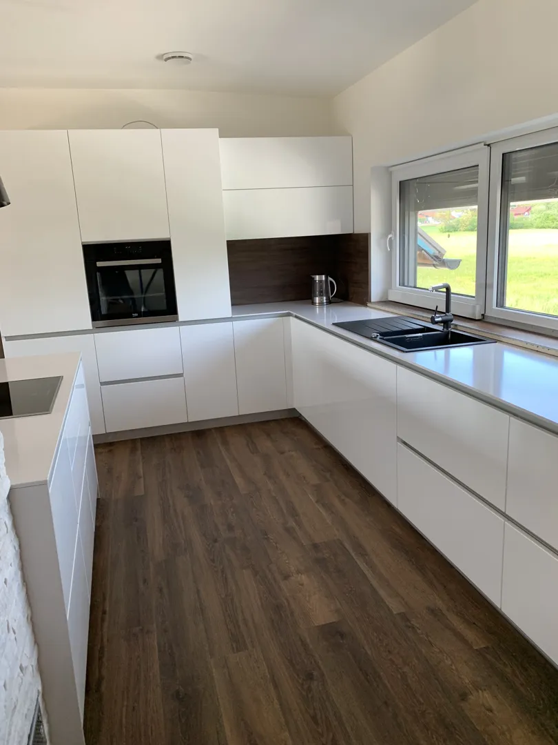 Predvidoma v mesecu avgustu se nameravamo vseliti v novo štirisobno stanovanje v Celovških dvorih v Ljubljani. Potrebujemo novo kuhinjo. Severna stena je dolžine cm, zahodna pa cm. Na zahodni steni bi bil prostostoječi hladilnik, tako bi bili kuhinjski elementi postavljeni samo v dolžini do cm. Na severni steni bi bil lijak in desno od njega pomivalni stroj, na skrajnem desnem robu pa visoko stoječa omara z vgradno pečico in mikrovalovno pečico. Na vzhodni steni bi bil nad štedilnikom prostor za kuhinjsko napo, sicer pa bi nad pultom namestili viseče, 80 cm visoke in 40 cm globoke široke stenske omarice s krilnimi vrati. Če je možno bi na zahodni steni ob hladilniku imeli visoko (cm ) omaro širine 40 cm in globine 60cm, ki bi bila izvlečna. V kotu pri spodnjih elementi bi radi imeli omarico z izvlečnim kotom. Hladilnik bo visok cm, nad njim bi radi imeli še dno visečo omarico višine 40cm, širine 60 cm in globine 60. Hvala za vašo ponudbo, lep pozdrav.