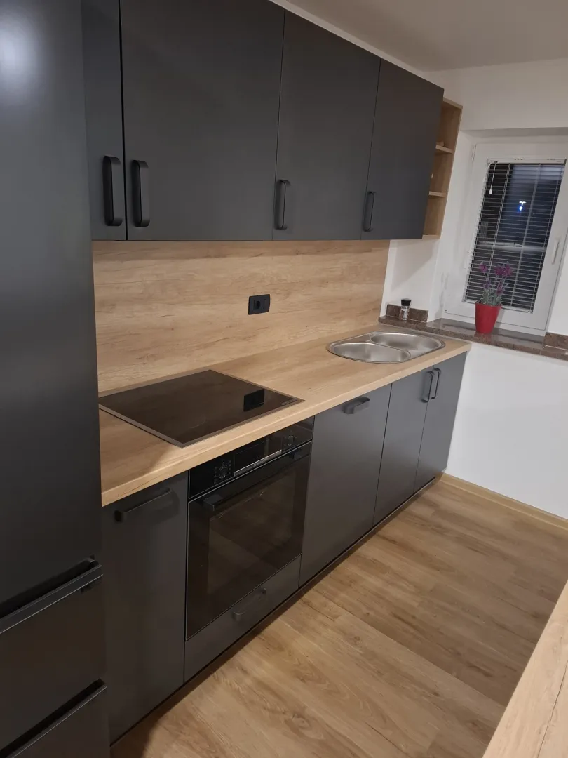 Pozdravljeni! Rad bi opremil kuhinjo. Skušal bom opisati njene dimenzije in kaj si želim. Kuhinja je v obliki črle U. Zato jo bom tako tudi opisoval in bom uporabljal termine leva stran, čelno, desna stran, gledano črko u z zgornje strani. Dimenzije: leva stran meri cm čelno cm in desna stran cm. Na začetku leve strani bi si želel visoko omaro šrine 80 cm visoko - cm za shranjevanje hrane. Nato pride v nadaljevanju visok hladilnik z zmrzovalnikom širine 55 cm. Ta hladilnik že imam in ostane v uporabi. Sledi na levi strani še cm pulta z nikimi omaricami do vogala, nato pride čelni del dolžine cm pult in nizke omarice in desna stran cm pult z pomivalnim koritom ki se zaključi v obstoječem zidanim štedilnikom. V čelnem delu kuhinje so tudi viseče omarice v dolžini cm in višini mislim okrog 80 cm. Kuhinja je brez vgradnih gosponinjskih aparatov, ker ti že obstajajo. Povzetek : Rabil bi omaro za hrano 80 x cm viseče omarice x 80 cm pulta cm v treh delih nizke omarice pod pultom cm Zanima me cena, ali je možna montaža in če je možen ogled in izbira frontov - prednjih delov kuhinje. Kakšne so možnosti z barvami, materiali? Sploh bi bilo odlično, če imate kakšne slike oz. možnost ogleda različnih materialov, barv ... Hvala in lep pozdrav