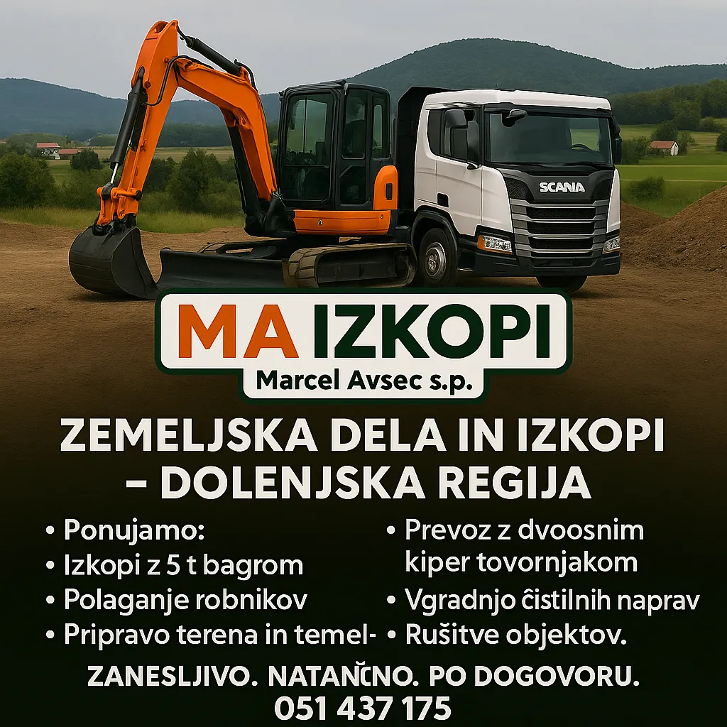 O nas: 🚜💥BAGERSKE STORITVE! 💥🚜 MA-izkopi marcel avsec s.p ✅ MOČ in NATANČNOST – Bager 5 ton za vsako delo! ✅ HITRA IZVEDBA – Delujem na območju dolenjske Novo mesto, Šmarješke toplice, Škocjan, Šentjernej itd. 🔹 IZKOPI – temelji, kanalizacija, drenaža, brežine, čistilne naprave (moznostjo vgradnje)… 🔹 PLANIRANJE TERENA – priprava za tlakovanje,robniki. 🔹 IZDELAVA DVORIŠČ – utrjevanje, nasutje. 🔹 MANJŠA RUŠITVENA DELA – garaže, zidovi, hiše. 🔹 PREVOZI Z KIPER TOVORNJAKOM– pesek, gramoz, zemlja