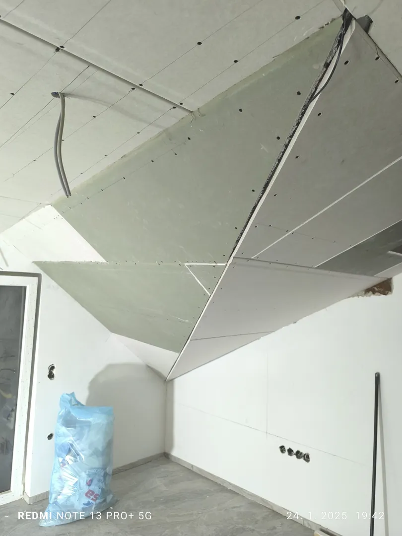 1. Izdelava mansardnih stropov na kovinski podkonstrukciji, mm+mm izolacija Knauf Unifit , parna zapora z alu folijo g in obloženo z mavčnimi ploščami 12,5mm, ter dobava in montaža revizijske odprtine /, ter bandažiranje 2x. (cca.m²) od tega v kopalnici zelene plošče (cca.9m²) 2. Izdelava oblog kolenčnih zidov na kovinski podkonstrukciji, 50mm izolacije Unifit in obloženo z mavčnimi ploščami 12,5mm ter bandažirano 2x. (cca. 9m²) 3. Izdelava oblog kolenčnih zidov na lepilo in obloženo z mavčnimi ploščami 12,5mm ter bandažirano 2x. (cca. 25m²)