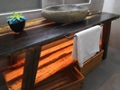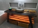 omara za kopalnico na kateri bosta stala dva umivalnika (dolzina , globina 50, visina 60 z 4 predali) , viseca omara za dnevno sobo (dolzina , globina 40, visina 50 z dvemi vrati)