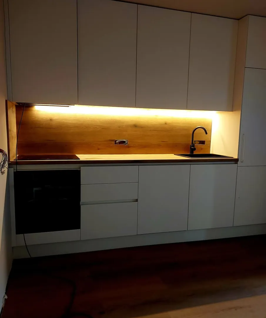 Gre se za kuhinjo v ravni liniji, dolžine cm. Širine cca. 60cm. Višine 90cm. Prvi element (60cm) bi imel vgrajeno kuhalno ploščo, sledi element z manjšo delovno površino (v spodnjem delu bi bil idealno izvlečni predal za plastenke/steklenice), tretji element je za pomivalno korito (cca. 80cm), potem sledi element z večjo delovno površino (cm) in na koncu še visoka omara z vgradno pečico. Elementi naj imajo čimveč prostora za shranjevanje. Na steni bi imela le 1 daljši, a bolj ozek element za shranjevanje krožnikov/kozarcev, po možnosti s steklom. Zraven tega pa še eno omarico za shranjevanje česa drugega. Barvo front bi želela v barvi lesa (kakšen bolj svetel odtenek), delovno površino pa v črni/sivi barvi. Odpiranje bi bilo idealno mehko, ročaji sivi/srebrni. Zraven pa potrebujem še kuhinjski otok dolžine cca. cm (lahko od -cm), širine cca 75cm (lahko od 60 do 80). Zopet v barvi lesa, z črno/sivo delovno površino. Idealno bi bilo, če bi tudi otok imel čimveč prostora za shranjevanje. Hvala že vnaprej :)