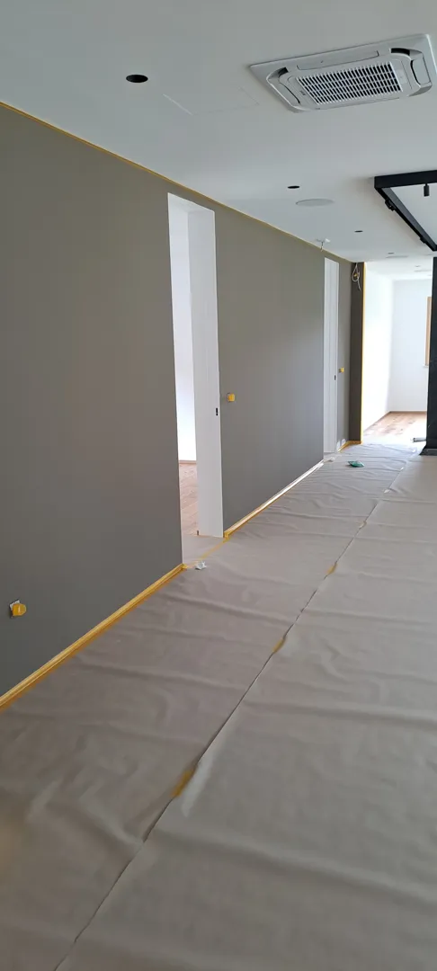Dvakratno slikanje notranjih ometanih sten in stropov z disperzijsko zidno barvo z vsemi preddeli, kitanje in brušenje. Barva bela. Lp