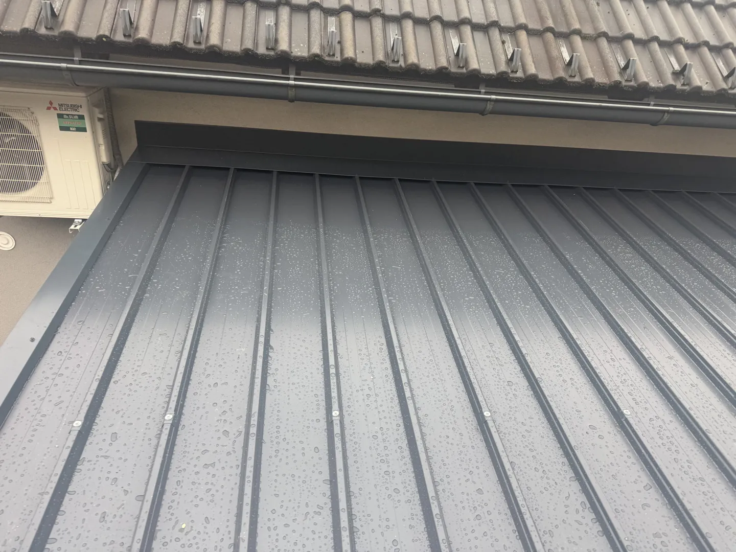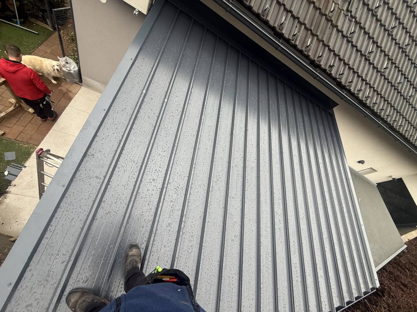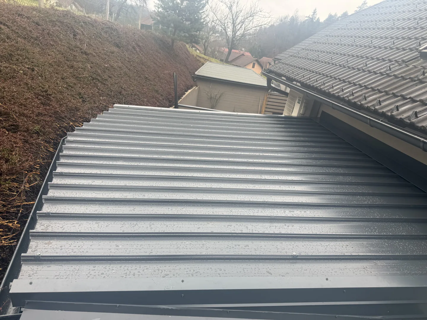 Pokrivanje novega nadstreška z ravno streho, z montažo žleba in obrob. Kritina pločevina s filcem. Hvala in lp.